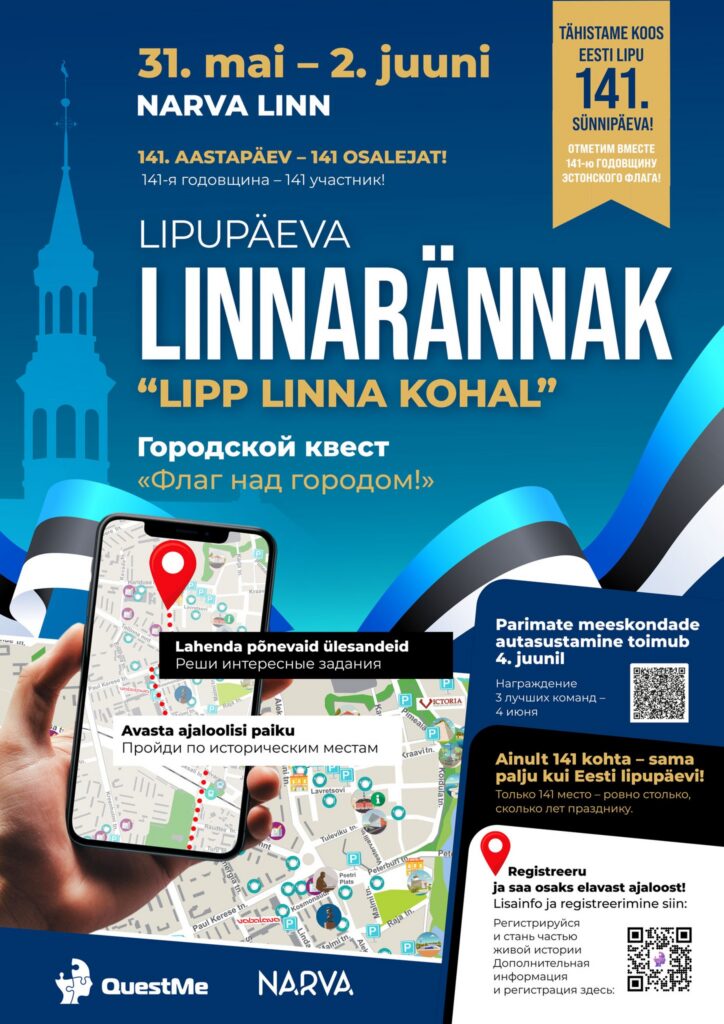 Квест пройдёт с 31 мая по 2 июня при помощи мобильного приложения и завершится праздничным награждением победителей. Участникам предстоит исследовать исторические уголки Нарвы, разгадывая интересные задания. Зарегистрироваться на квест можно по ссылке, или по QR-коду на афише. Количество участвующих ограничено.