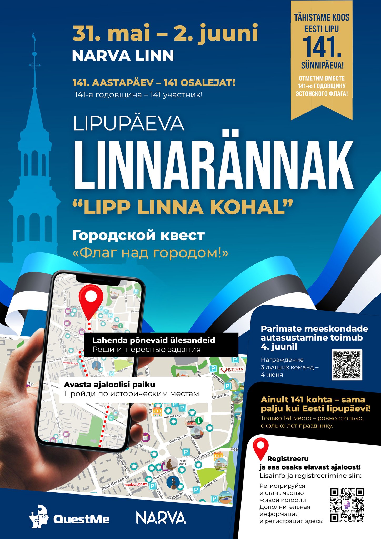 В среду, 4 июня, в Эстонии отметят 141-ю годовщину государственного флага. По этому случаю город Нарва приглашает 141 участника принять участие в бесплатном городском квесте «Флаг над городом!», который пройдёт с 31 мая по 2 июня.