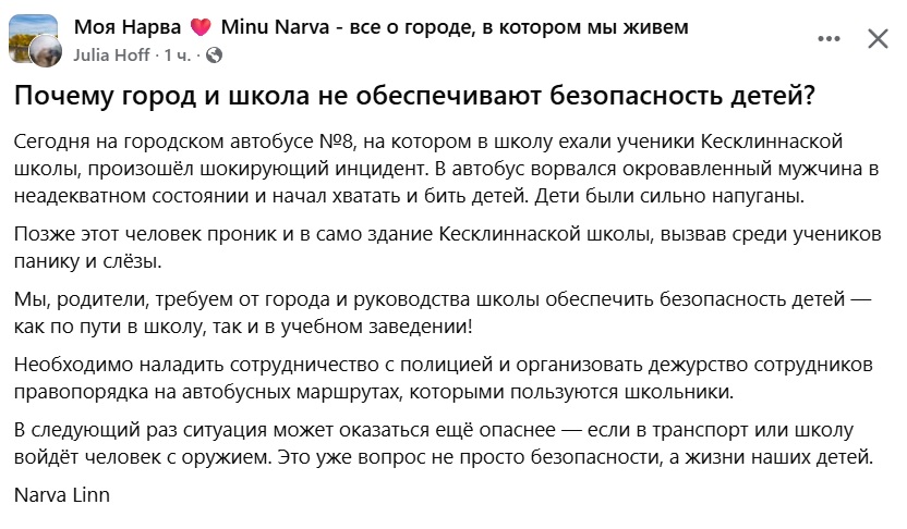 Чуть позже поступления пресс-сообщения от Департамента полиции и погранохраны в группе “Моя Нарва” в Facebook обеспокоенные родители опубликовали обращение к городу и руководству школы: