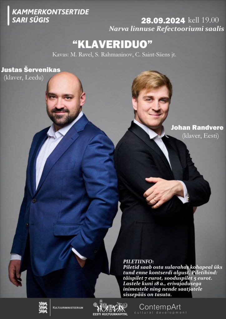 28 сентября в 19:00 в зале Рефекториум Нарского музея, в цикле осенних камерных концертов, пройдёт концерт «Фортепианный дуэт», где Йохан Рандевере (фортепиано, Эстония) и Юстас Шервеникас (фортепиано, Литва) исполнят произведения М. Равеля, С. Рахманинова, К. Сен-Санса и других.