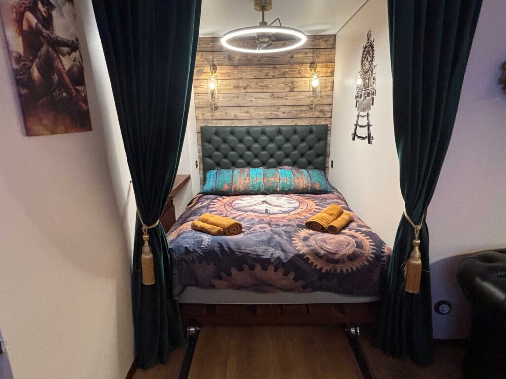 Оформление апартаментов может удивить вас еще многими деталями, и в этом заслуга второго владельца City-Steampunk – Ирины Рядновой. «Ирина в нашем партнерстве отвечает за дизайнерские решения, многое из этого она сделала сама», – поясняет Максим. Своеобразия апартаментам добавил и он сам: объект управляется по системе «умный дом».