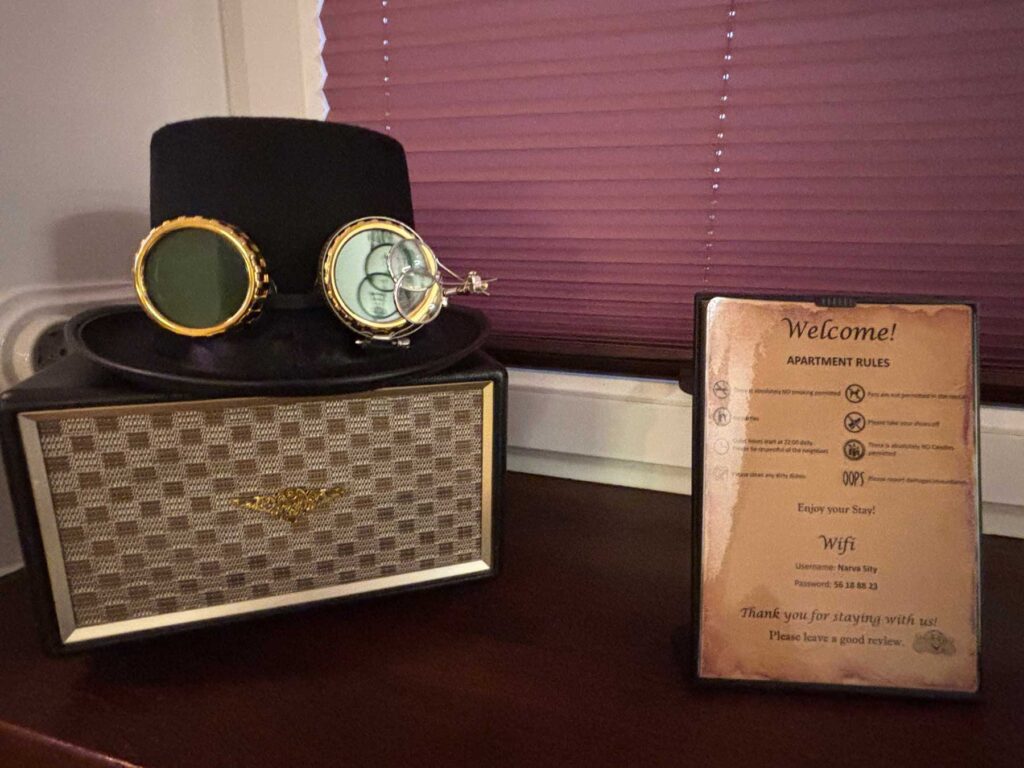 Изучая категорию дорогого жилья в Нарве, мы наткнулись на пример, воодушевивший нас безмерно. Об этих апартаментах с гордостью за Нарву написала в Фэйсбуке Елена, подруга снимавших их людей. «Новейшие апартаменты в стиле стимпанк начиная от дверного замка заканчивая вроде бы обычной столовой вилкой… во всем прослеживается уникальность и любовь», – так отрекомендовала City-Steampunk Елена. И подтвердила свои слова фотографиями.