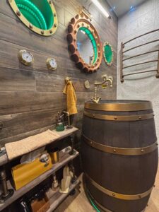 Первая зона, как выясняется, заточена на морскую тематику. Ее изюминки – раковина, закрепленная на бочке из-под виски, и иллюминаторы с настоящего эстонского судна. Зона вторая – техническое ретро: светильники, посуда, радиаторы, камин… Третья зона делает отсылку к пассажирскому купе первых поколений.
