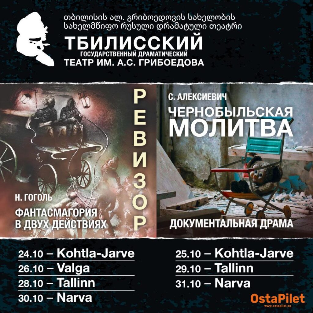 30 октября в 19:00 на сцене Дома культуры “Ругодив” в Нарве легендарный Тбилисский Государственный академический русский драматический театра имени А. С. Грибоедова с постановкой Автандила Варсимашвили по произведению Н. В. Гоголя “Ревизор”. А 31 октября в 19:00 – премьера 2024 года “Чернобыльская молитва”. Билеты уже в продаже в кассе ДК «Ругодив» и на сайтах: