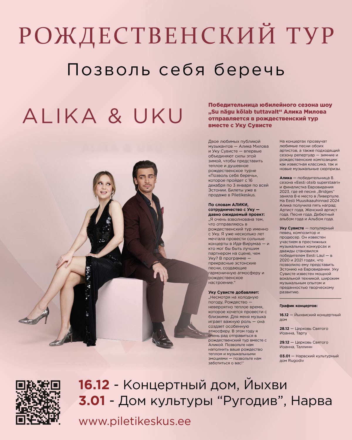 Двое любимых публикой музыкантов — Алика Милова и Уку Сувисте — впервые объединяют силы этой зимой, чтобы представить теплое и душевное рождественское турне «Позволь себя беречь», которое пройдет с 16 декабря по 3 января по всей Эстонии. Билеты уже в продаже в Piletikeskus.
