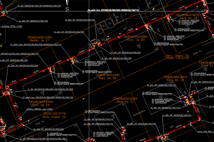 Помимо подробного описания рельефа местности, на геодезическом плане также показаны все подземные инженерные сети, высоты уровня земли и другие элементы. Геодезический план разбивки трассы согласовывается с владельцами трассы. Обычно геодезические планы разрабатываются в масштабе 1:500, но при необходимости используются также масштабы 1:200 (Старый город Таллинна) и 1:1000 (длинные трассы и дорожные работы).
