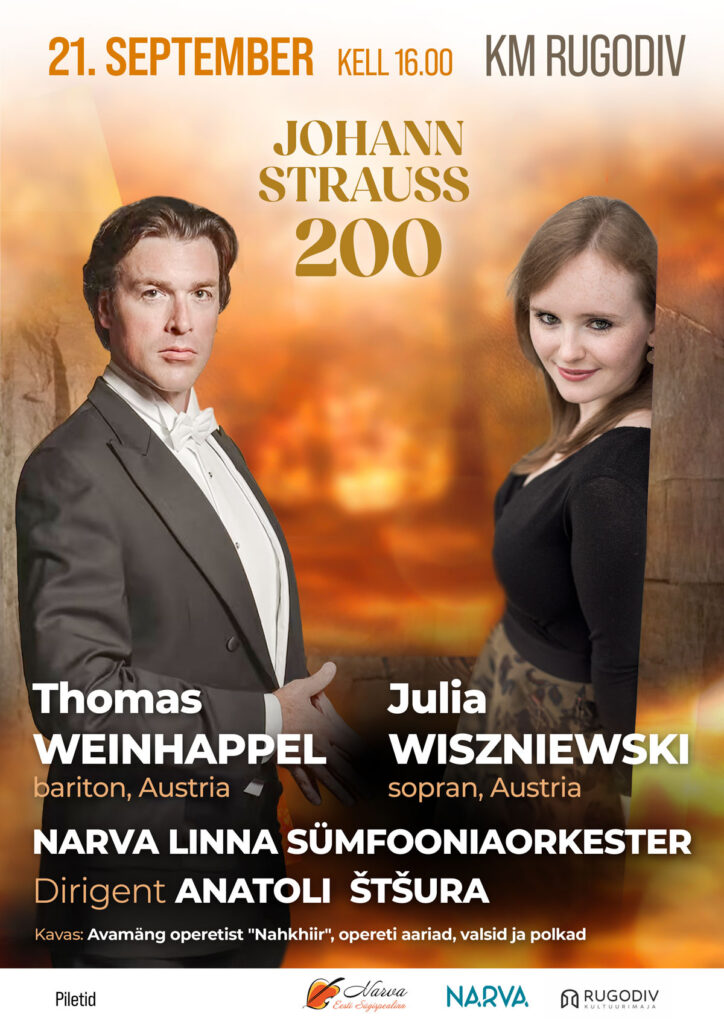 В канун наступления астрономической осени, в воскресенье, 21 сентября, на сцене Дома культуры «Ругодив» Нарва по традиции торжественно примет эстафету культурной столицы Эстонии. Городской симфонический оркестр предложит программу в честь значимого события года – 200-летия со дня рождения «короля вальса» Иоганна Штрауса – сына. Гости вечера, всемирно известные солисты из Австрии сопрано Юлия Вишневски и баритон Томас Вайнхаппель придадут событию истинно венский шарм.