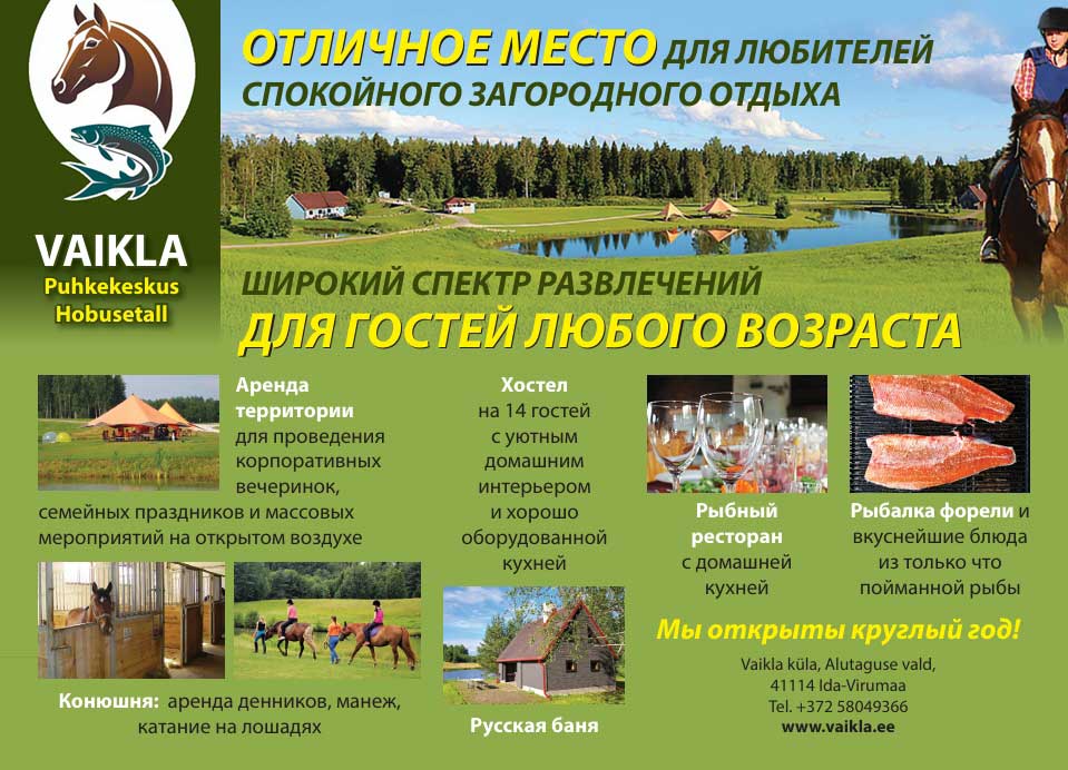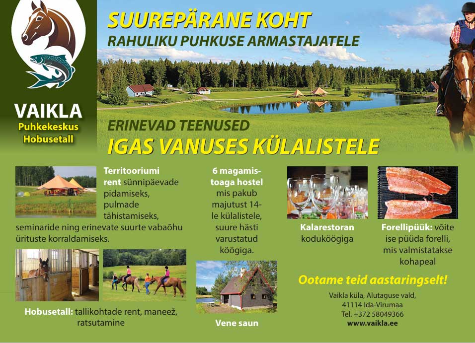 Центр отдыха “Конюшня Вайкла” расположен в 2 часах езды от Таллинна в живописном уголке Эстонии, в лесном массиве Алатагузе вблизи Чудского озера.
