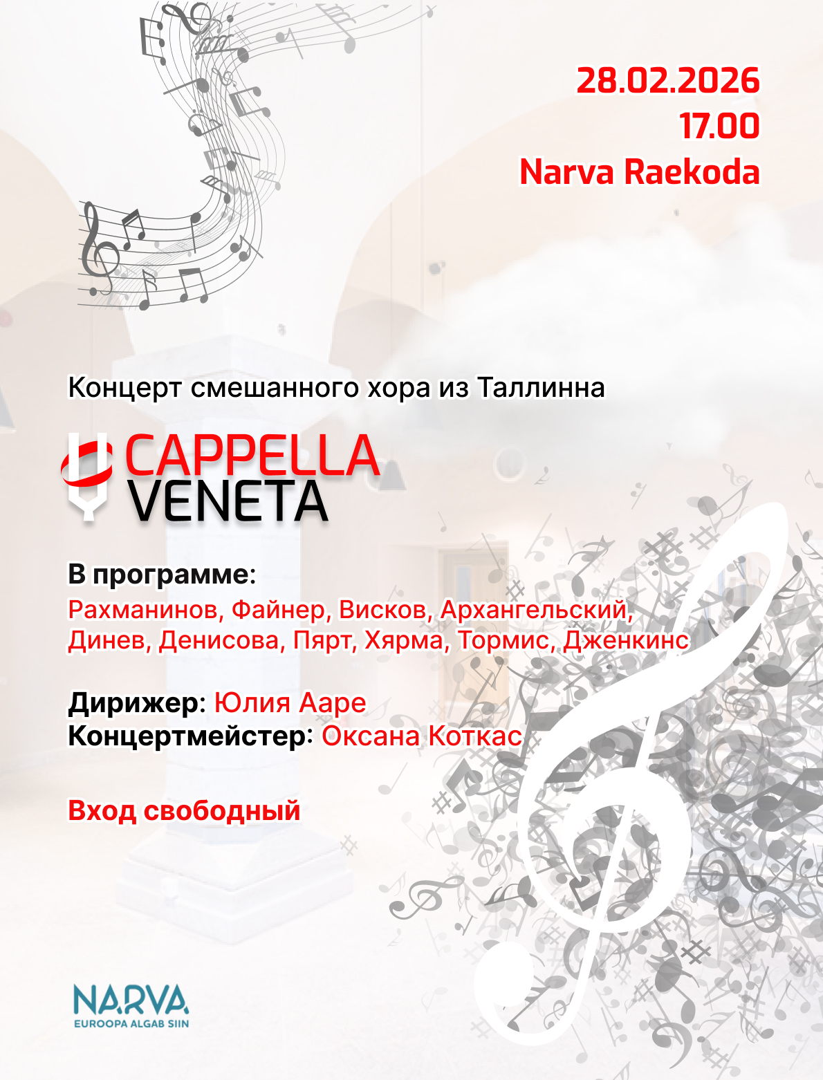 28 февраля в нарвской Ратуше в 17:00 пройдёт концерт таллиннского смешанного хора Cappella Veneta. В программе: Рахманинов, Файнер, Висков, Архангельский, Динев, Денисова, Пярт, Хярма, Тормис, Дженкинс