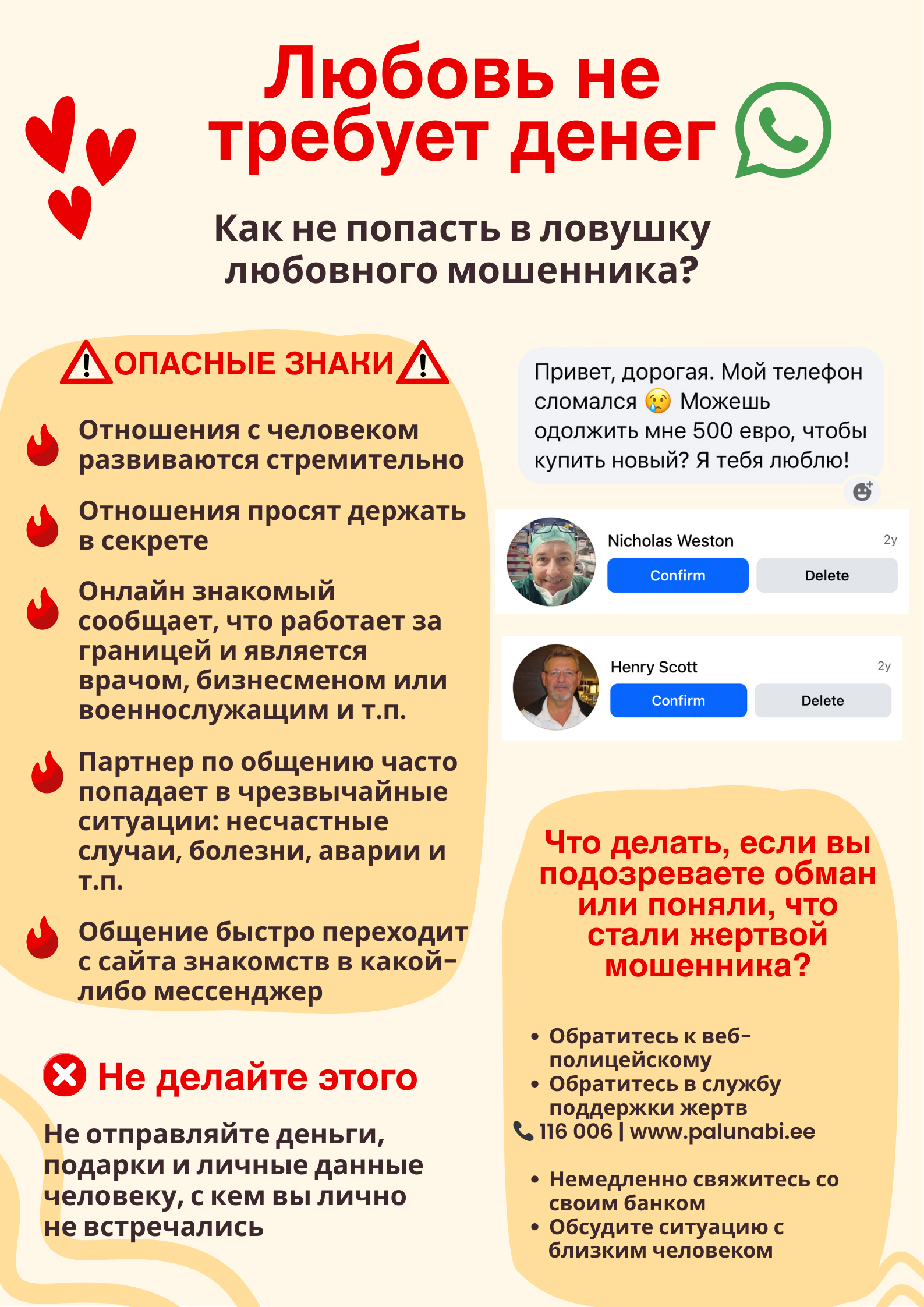 Никогда не стоит делиться своими личными данными, банковской информацией, кодами и делать переводы людям, с которыми вы не встречались в реальности. Правило простое: любовь не просит денег! В случае сомнений стоит обсудить ситуацию с близким человеком или обратиться за советом в полицию.