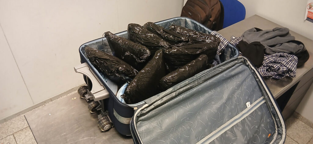 Во время проверки в чемодане 55-летнего пассажира нашли восемь чёрных пластиковых пакетов с измельчённым растительным веществом зеленовато-коричневого цвета общим весом 9,66 килограмма. В багаже 47-летнего мужчины также обнаружили восемь пакетов с аналогичным содержимым — всего 8,98 килограмма.