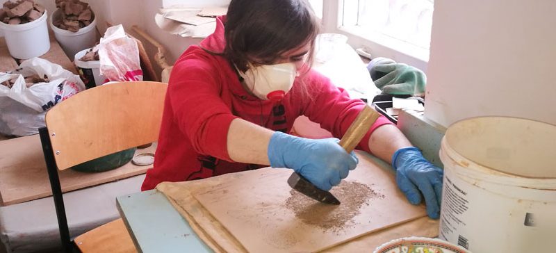 Костя знает, что в производственной цепочке на нем лежит особая ответственность, так как от его действий зависит конечный результат: он раскатывает кусок глины нужной толщины и делает при помощи шаблона основу для кружки, чтобы в итоге она получилась ровная и красивая.