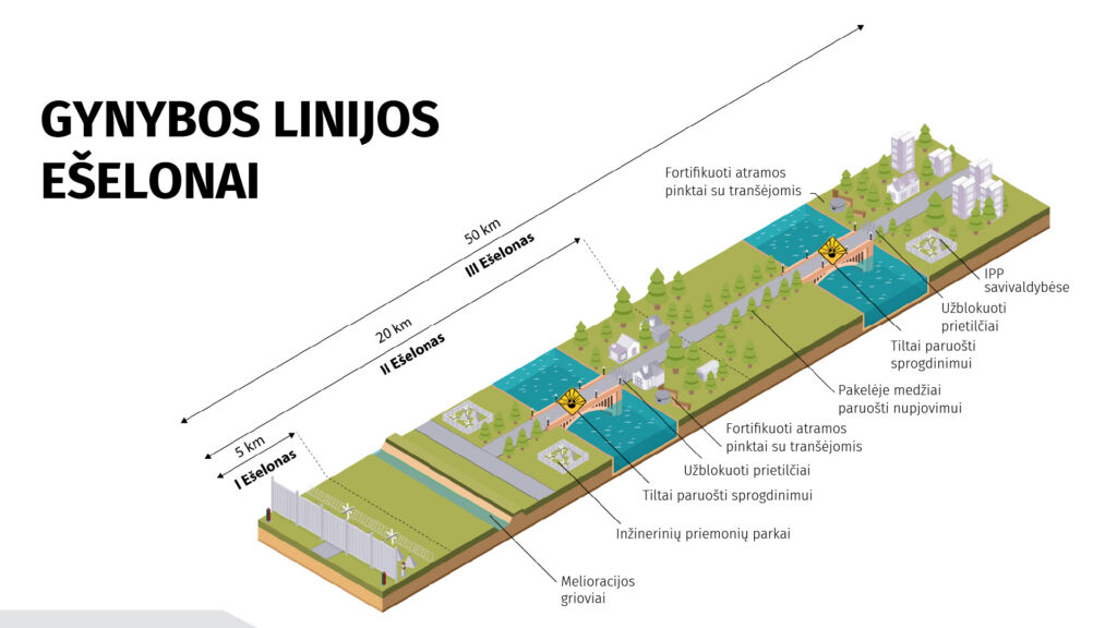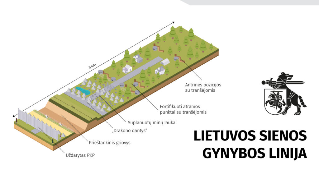 Министерство обороны Литвы обнародовало план создания пограничных укреплений, который предусматривает возведение трехуровневой линии обороны, состоящей из противотанковых заграждений, минных полей и укрепленных позиций, глубиной 50 километров, пишет ERR.